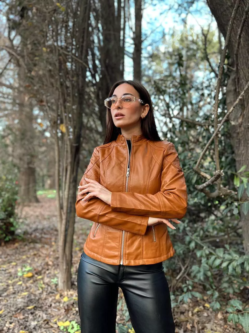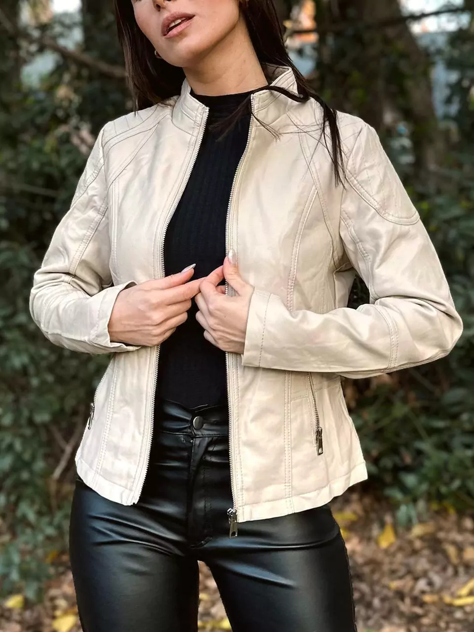Campera de ecocuero con bolsillos. Medidas aproximadas: Talle M Sisa 43 cm Largo 55 cm, Talle L Sisa 45 cm Largo 56 cm, Talle XL Sisa 47 cm Largo 57 cm y Talle XXL Sisa 49 cm Largo 58 cm.