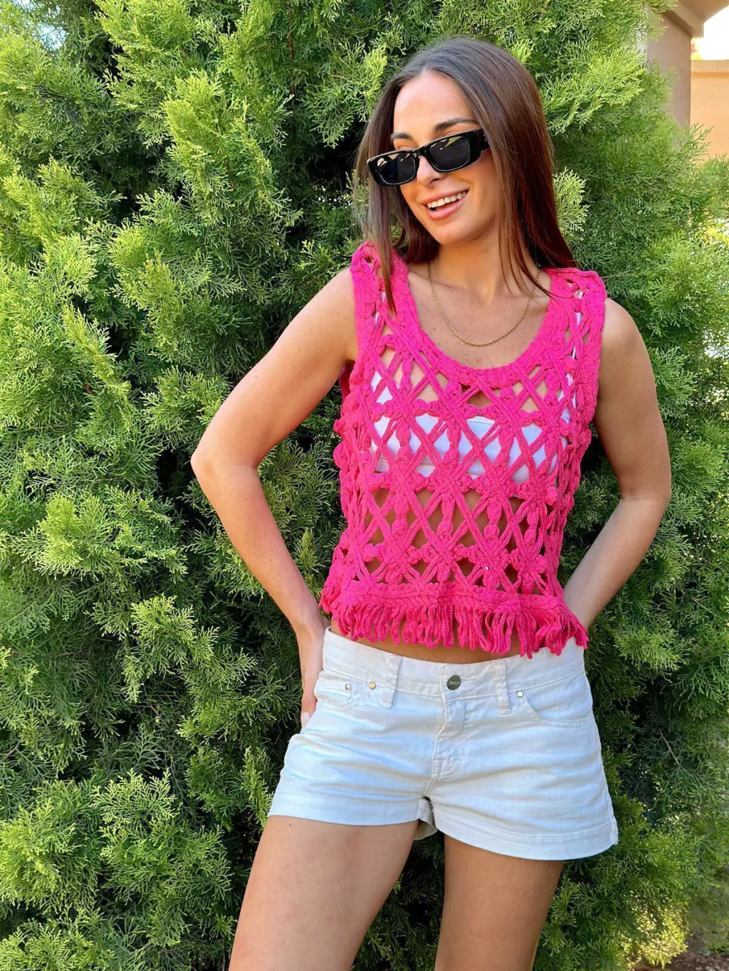 Musculosa Premium Crochet con Flecos Abajo. Medidas Aproximadas: Talle M Sisa 46 cm Largo 49 cm y Talle L Sisa 48 cm Largo 49 cm.