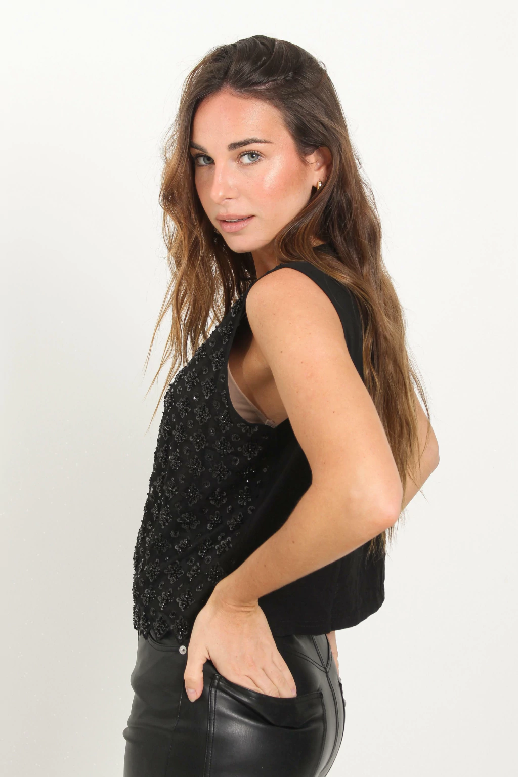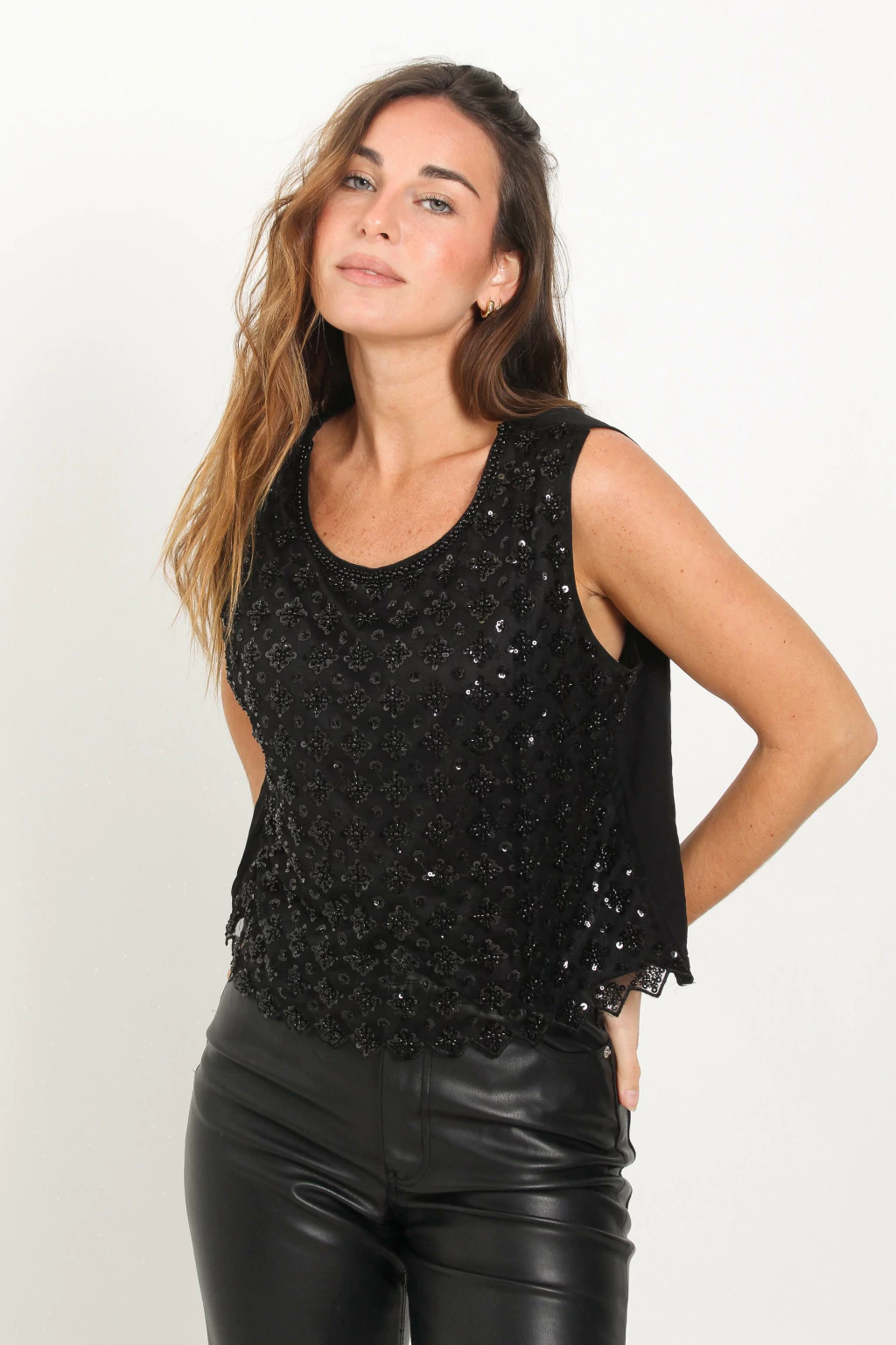 Musculosa Premium Forrada con bordado de lentejuelas mostacillas y perlitas con terminacion en picos. Medidas Aproximadas: Talle M Sisa 50 cm Largo 48 cm, Talle L Sisa 52 cm Largo 49 cm y Talle XL Sisa 54 cm Largo 50 cm.