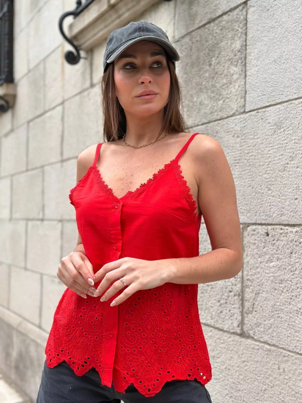 Blusa Premium Broderie con Bretel Regulable y Botones. Medidas Aproximadas: Talle 1 Sisa 44 cm Largo 60 cm y Talle 2 Sisa 46 cm Largo 60 cm.
