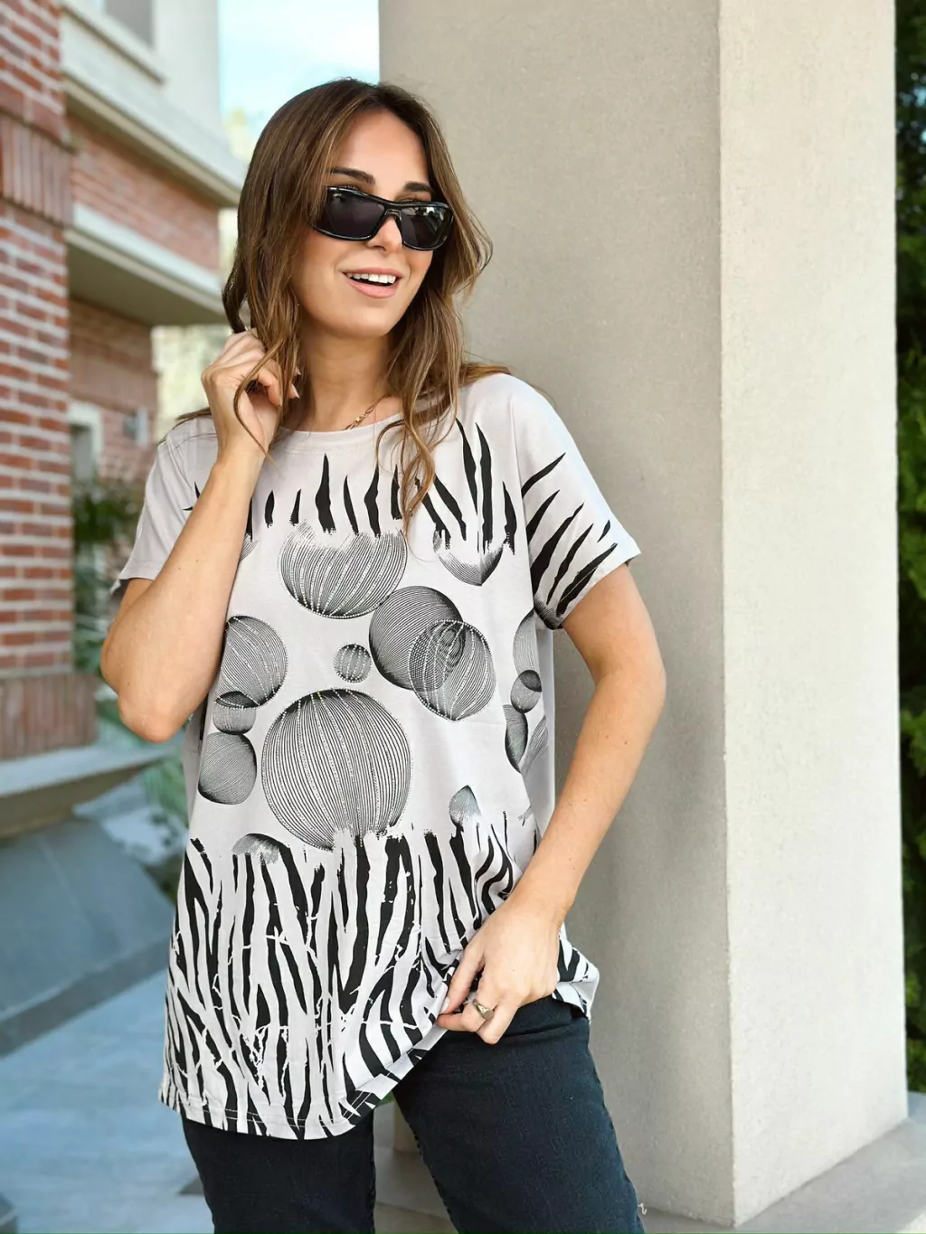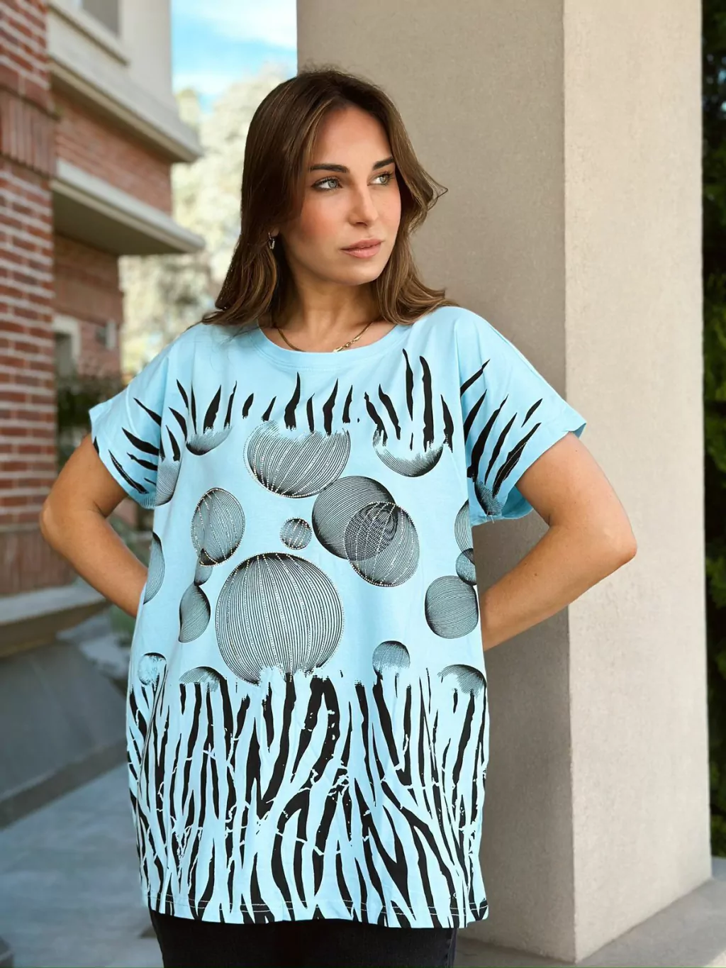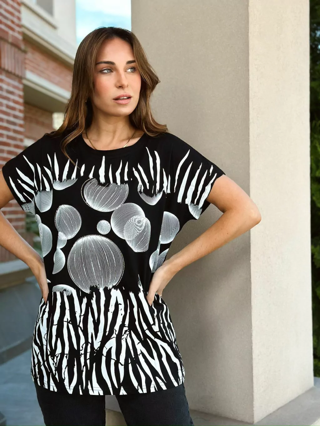 Remeron Premium de algodon Lycra Estampado con Brillos. Medidas Aproximadas: Talle S/M Sisa 56 cm Largo 70 cm y Talle L/XL Sisa 58 cm Largo 71 cm.
