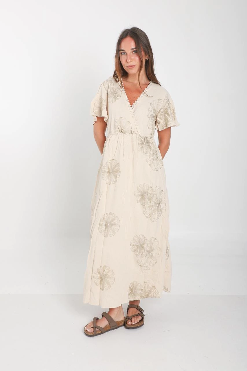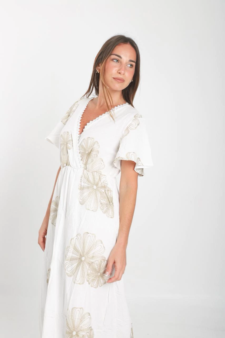 Vestido Escote V de Lino con forreria con bordado en hilo con lurex